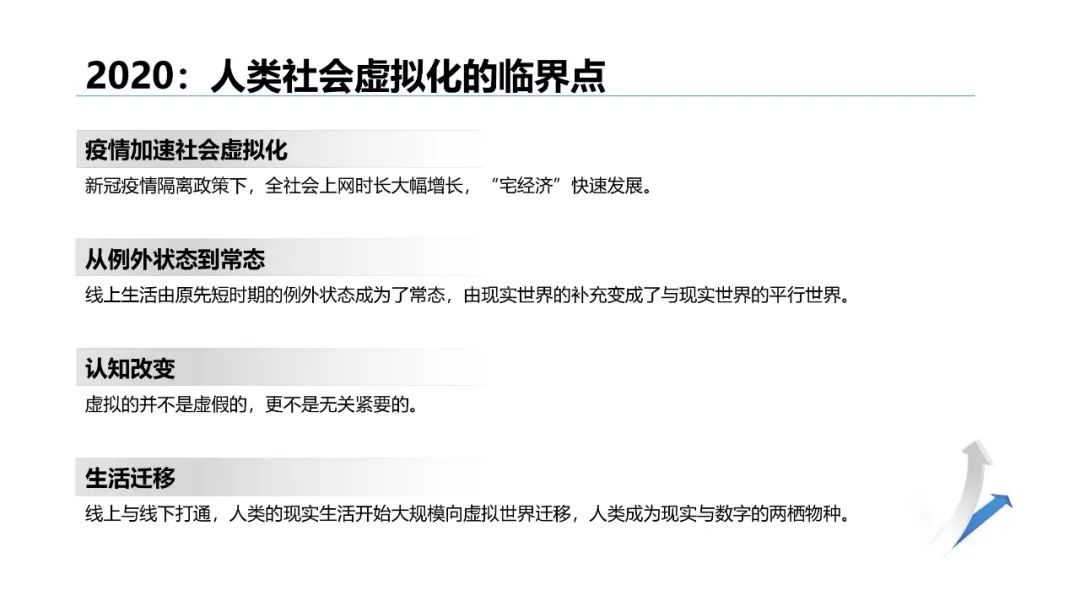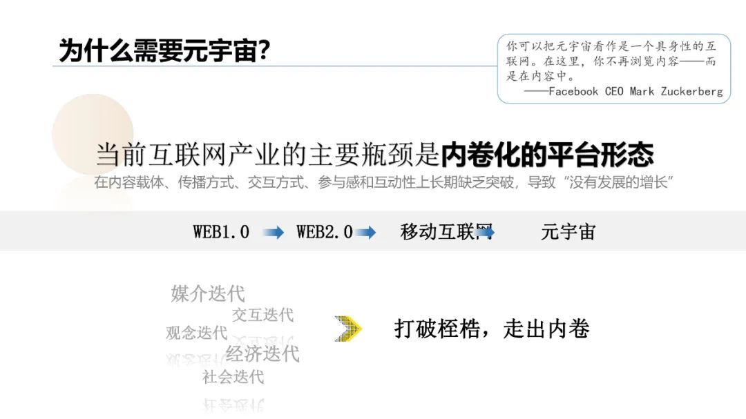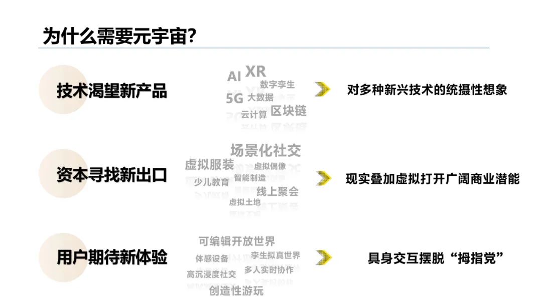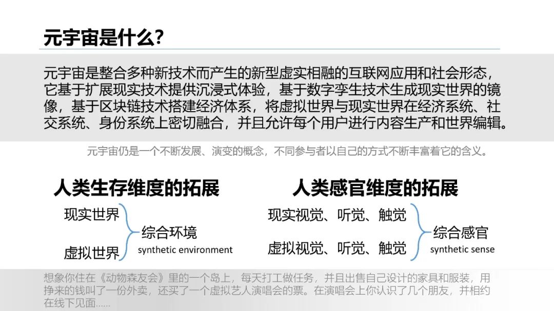 2021年是元宇宙(MetaVerse)的元年。堪比大航海时代的大迁徙,人类全面走进数字世界,开辟鸿蒙、创世而生。创造、生活、娱乐,乃至工作的数字时空,是为元宇宙。其中,需要重新思考存在和虚无、肉体和精神、性善和性恶、自我和宇宙的哲学命题,需要不断探索有限和无限、秩序与自由、自治与法治、经济与治理、伦理和文明的边界,需要全面融合区块链、AR、5G、大数据、人工智能、3D引擎等新技术,形成数字创造、数字资产、数字市场、数字货币、数字消费的新模式。元宇宙是“心”的绽放,是“梦”的具象,是“我思故我在”的全息展现。内求于心,外形于物,物物相生,元宇宙成矣。或许,互联网的终极形态就是“元宇宙”。