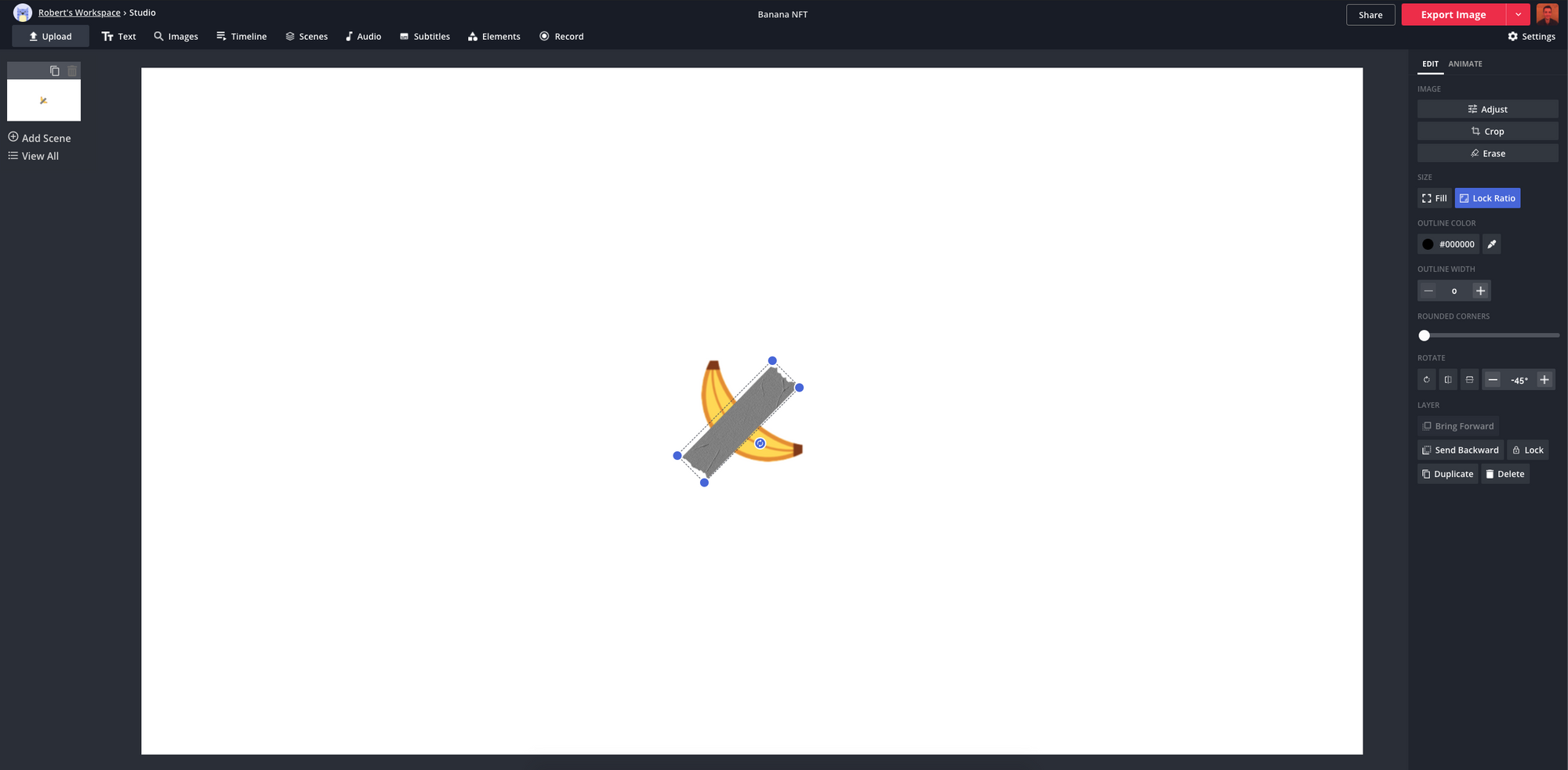 Inspired by artist Maurizio Cattelan's divisive 2019 piece "The Comedian," I used the Kapwing Studio Editor to create my first NFT in just a few minutes. Cattelan's piece consisting of a banana duct-taped to a wall sold for an astounding $120,000 at the Art Basel in Miami, and I figured a digital recreation could very well demand the same price on the blockchain.